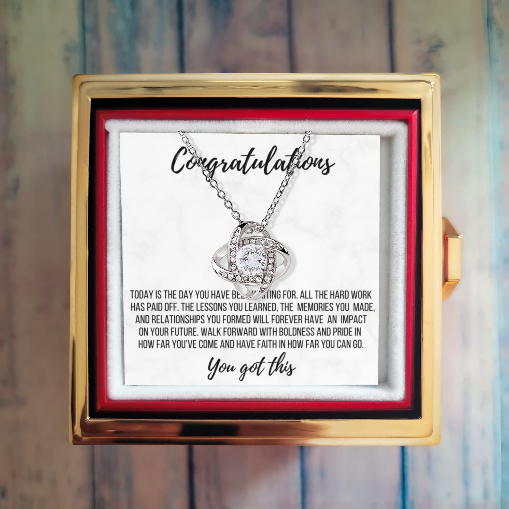 Imagine her reaction as she receives this beautiful Love Knot Necklace. Representing an unbreakable bond between two souls, this stunning pendant is adorned with premium cubic zirconia crystals, making it a timeless symbol of love and devotion. The luxurious box, featuring a meticulously preserved rose that never fades, adds an extra touch of love. With a simple turn of the gold knob, her breathtaking gift is revealed—making it the perfect sentimental gift for that special someone.
